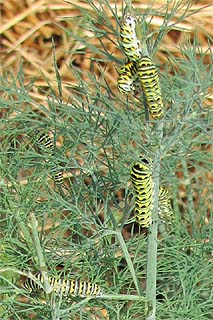 Dill leaves are best used fresh, so it is recommended that you keep a supply of plants rather than store the leaves. But if you find that you have cut more dill than you can use, dry the excess in the microwave. Spread the dill in a single layer on a paper towel and microwave on high for 3 minutes. After microwaving, remove and discard the hard stems, crumble the leaves, and store in an airtight container protected from light. Once the seed heads begin to form, it is time to stop cutting dill for fresh use. Allow the seed heads to develop and after they are completely dry, cut them. You will be able to remove the seeds easily with your fingers. The seeds can be used in baking but be sure to save a few for planting next spring. Dill is the larval plant for the Black Swallowtail Butterfly. The butterfly will lay her eggs on dill and when the eggs hatch the larvae will feed on the dill plants. It would be rare for the caterpillars to completely destroy a plant. Just leave the caterpillars be and in a few weeks you will be blessed with butterflies sipping nectar from your flowers.