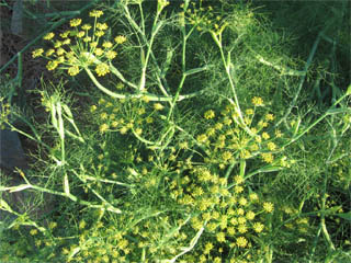 All parts are edible. When the plant is established, leaves can be snipped and stored loosely in containers or frozen for later use. Stems are ready for harvest when they begin to fatten (about 80 days to maturity). Harvesting seeds requires precise timing. Watch closely for seeds to turn from yellowish green to brown. Cut entire head; let it drop into a brown paper bag and store in a warm dark place for further drying. Once dry, store in jars for year-round keeping. Fennel tastes like a softer and nuttier version of anise. Use fresh leaves in salads and as lacy garnishes; the tender stems can be eaten like celery. Fennel fares well with fish, sausages, duck, barley, rice, cabbage, sauerkraut, beets, pickles, potatoes, lentils, breads, eggs, and cheese. The leaves and stems add aroma and flavor to herb butters, salad dressings, and Chinese marinades.